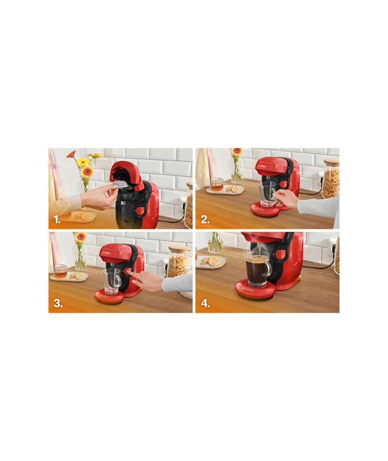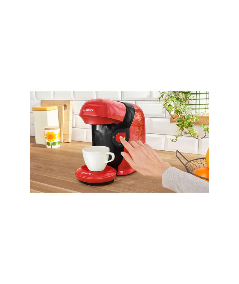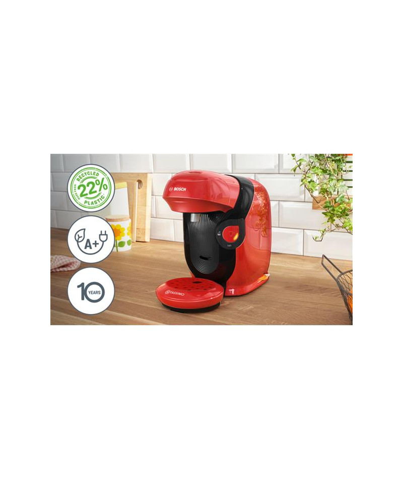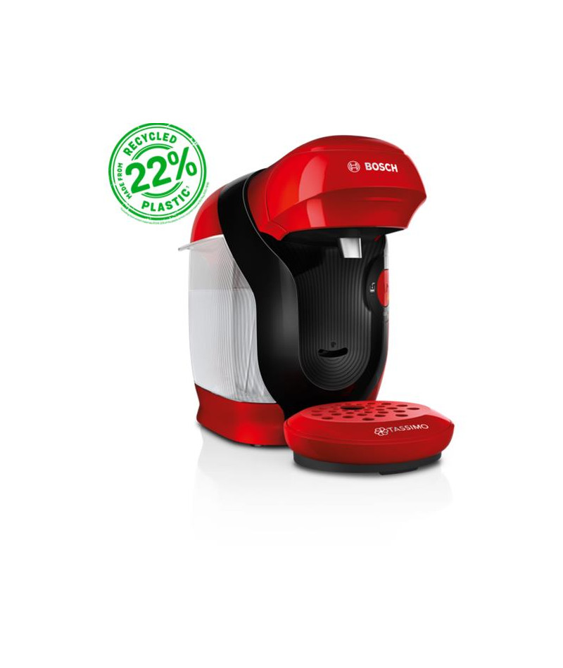 Cafetière multi-boissons Rouge - Tassimo Style - La convivialité s’invite chez vous ! - Avec Tassimo, c’est l’assurance de déguster un délicieux café, un thé ou encore un chocolat à tout moment ! - Une machine multi-boissons petite par la taille mais grande par la saveur, conçue dans une démarches responsables avec des dimensions compactes (26.5 x 17.1 x 32 cm) et un design moderne ! - Éco-conçue : fabriquée à partir de 22% de plastique recyclé, faible consommation d’énergie, testée sur 10 ans d‘utilisation - Une boisson parfaite grâce à la technologie unique de reconnaissance du code-barre - Machine entièrement automatique : un clic et c'est prêt ! - Technologie T-Discs unique et brevetée : le système ajuste automatiquement le volume d'eau, la température, le temps de préparation et s'arrête automatiquement lorsque la boisson est prête - Personnalisation de la boisson grâce au mode Manuel : vous pouvez allonger ou raccourcir la boisson pendant sa préparation - Bouton de commande unique - Indicateurs lumineux pour suivre la préparation - Repose-tasse amovible et ajustable sur 2 niveaux - Réservoir d'eau amovible 0.7 L intégré sur le côté - Nettoyage vapeur systématique après chaque boisson : pas de transfert de goût - Pas de temps de préchauffage ni de temps d'attente entre 2 boissons grâce au système Thermoflux - Programmes de détartrage et de nettoyage automatique (T-Disc de service) - Choix unique de plus de 40 boissons de grandes marques : café, expresso, café crème, cappuccino, latte macchiatto, chocolat chaud, thé, etc... - Arrêt automatique après 90 secondes - 3.3 bars - Coloris Rouge - Puissance 1400 W - Garantie 2 ans.