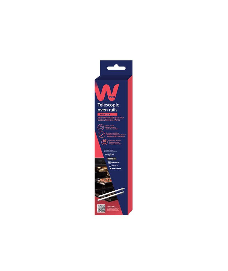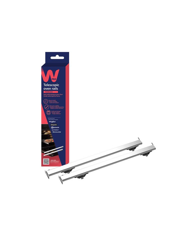 Rails télescopiques Wpro TOR200NBI - Ces rails télescopiques sont conçus pour simplifier l’utilisation de votre four au quotidien - Ils permettent de sortir en douceur les grilles et les plaques de cuisson pour accéder facilement à vos préparations sans risque de basculement - Grâce à leur conception robuste, ils assurent un coulissement fluide et sécurisé même à haute température - Leur installation est un jeu d’enfant : ils se fixent à n’importe quel niveau de cuisson sans outils ni vis, offrant ainsi une flexibilité maximale selon vos besoins - Compatibles avec de nombreuses marques telles que Whirlpool, Hotpoint, Bauknecht, KitchenAid et Ignis, ils s’adaptent à la majorité des fours encastrables du marché - Pratiques et résistants, ils optimisent le confort d’utilisation tout en améliorant la sécurité et la maîtrise de vos cuissons - Non compatibles avec la fonction vapeur et non lavables au lave-vaisselle.