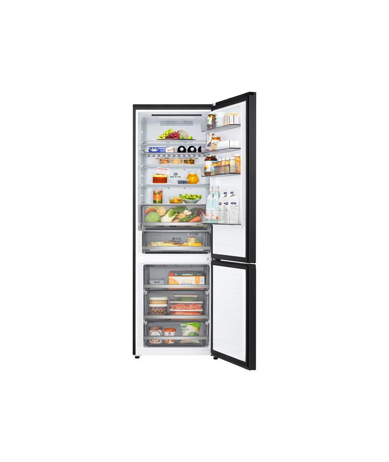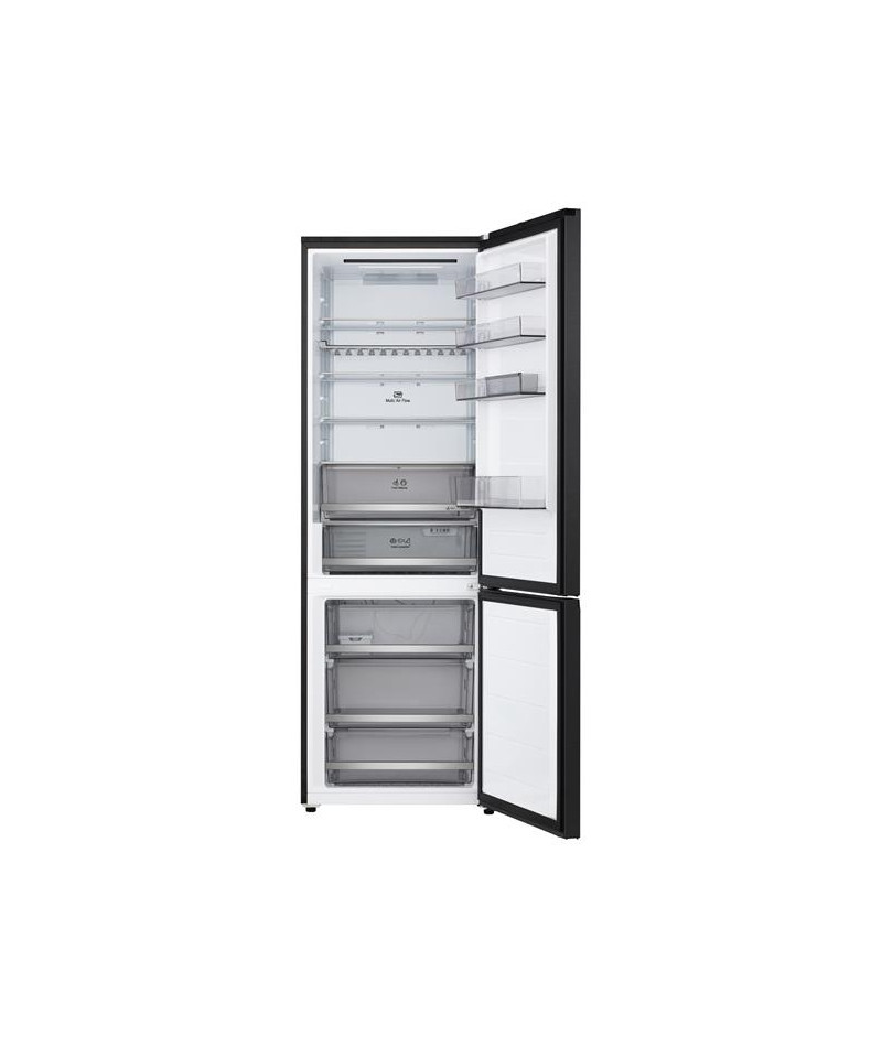 Réfrigérateur combiné LG GBBW322CEV - Avec sa grande capacité de 465 litres dont 279 litres pour le réfrigérateur et 186 litres pour le congélateur, ce modèle offre un espace généreux et modulable - Son froid ventilé Total No Frost assure une température homogène et sans givre dans les deux compartiments pour une conservation optimale - Ses fonctions Door Cooling, Multi Air Flow, réfrigération express, congélation express, mode vacances et connectivité LG ThinQ garantissent praticité et maîtrise de la fraîcheur - Côté équipement, vous profitez de 3 clayettes dont une porte-bouteilles, 4 balconnets et 3 tiroirs de congélation, ainsi que deux tiroirs Fresh Balancer et Fresh Converter pour fruits, légumes et viandes - L’éclairage Soft LED uniforme illumine l’intérieur sans éblouir pour un confort d’usage quotidien - La régulation électronique avec alarme porte ouverte et compresseur Smart Inverter assure un contrôle précis et silencieux - Ce réfrigérateur pose-libre de 203 cm de hauteur par 69,7 cm de largeur et 70,4 cm de profondeur adopte un design noir mat moderne et des portes réversibles sans déport pour s’intégrer facilement dans votre cuisine.