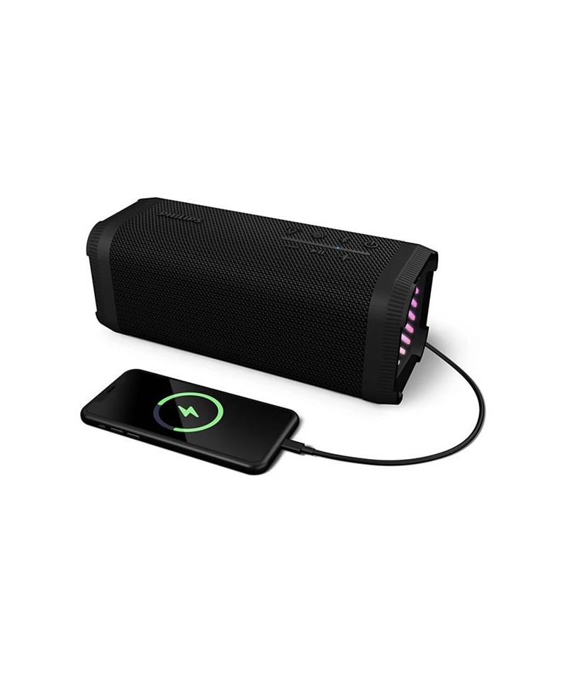 Enceinte Bluetooth Philips TAS5000EB - Cette enceinte robuste et élégante offre une puissance sonore impressionnante de 70 W max avec des basses profondes grâce à la technologie Bass+ et à ses membranes passives - Avec 24 heures d’autonomie et une batterie amovible facilement remplaçable, elle est pensée pour durer et vous accompagner dans toutes vos sorties - Son indice IP67 la rend totalement étanche à la poussière et résistante à l’immersion, idéale pour la plage, le camping ou une soirée en extérieur - Elle intègre aussi une fonction batterie de secours pour recharger votre smartphone en cas de besoin - Sa connectivité Bluetooth 5.4 multipoint assure une diffusion fluide et stable, et vous pouvez lire votre musique via USB-C ou associer plusieurs enceintes grâce au TWS ou à la technologie Auracast pour une expérience immersive - Les LED RGB colorées synchronisées au rythme de la musique créent une ambiance festive avec 5 modes d’éclairage disponibles - Le micro intégré facilite vos appels en mode mains libres et l’application Philips Entertainment permet un contrôle intuitif du son, des effets lumineux et de la gestion de la batterie - Fabriquée avec des plastiques recyclés certifiés, elle allie performance, praticité et démarche responsable.