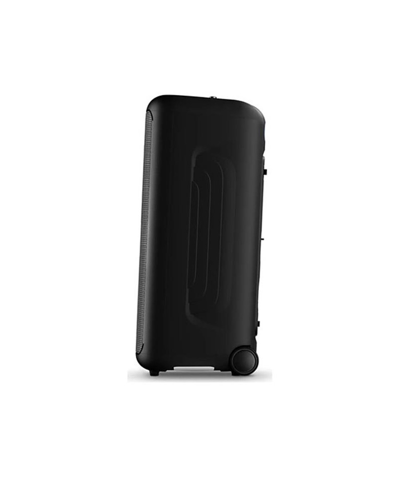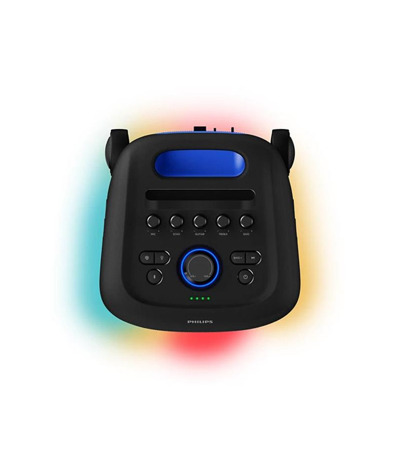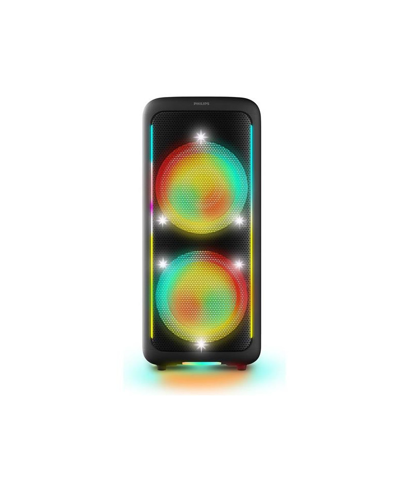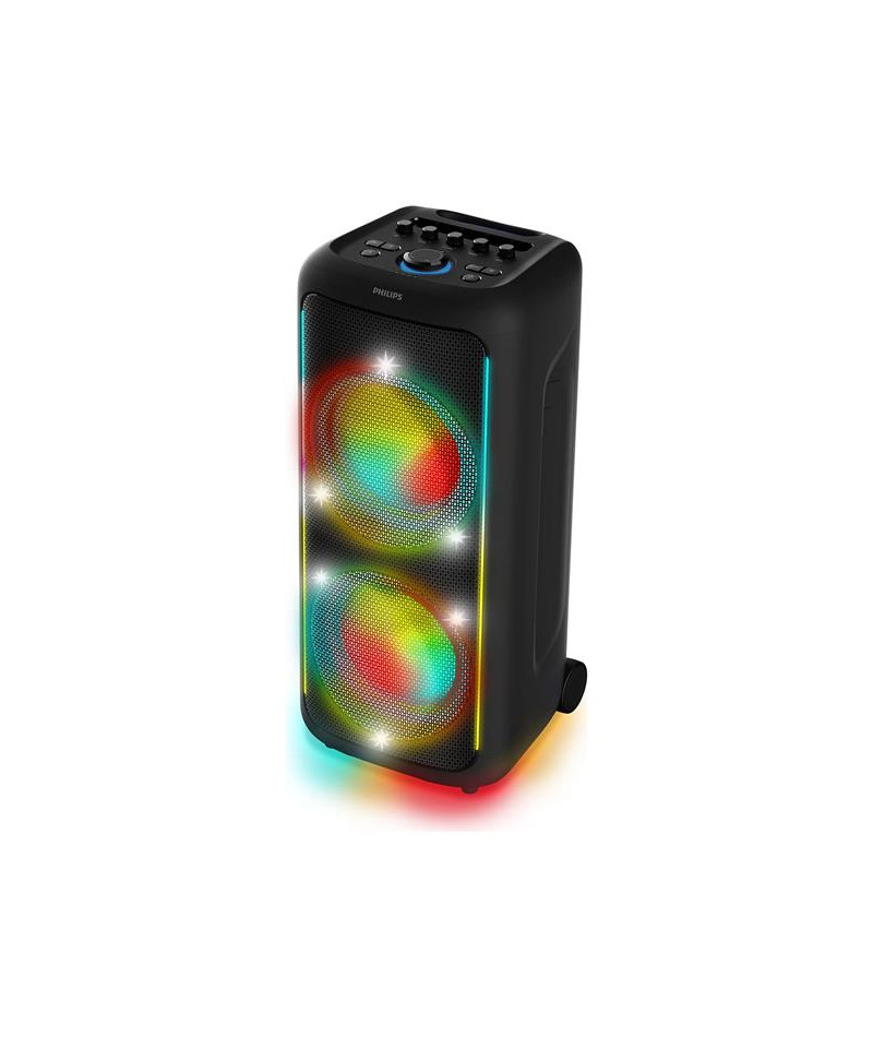 Enceinte de fête Philips TAX5000E - Offrez à vos soirées une puissance sonore impressionnante avec 200 W max et 100 W RMS, associés à la technologie Bass+ qui garantit des basses profondes et maîtrisées même à faible volume - Équipée de deux woofers de 8 pouces et de deux tweeters de 2 pouces, elle diffuse un son riche et équilibré pour un effet immersif - Son spectacle lumineux à 13 modes synchronisés au rythme de la musique transforme chaque espace en véritable piste de danse - Dotée de deux entrées micro et d’une entrée guitare avec effets d’écho, elle est parfaite pour le karaoké et les improvisations musicales - Sa batterie lithium-ion offre jusqu’à 14 heures d’autonomie et peut être remplacée facilement, tandis que l’entrée secteur garantit une fête ininterrompue - Grâce à la technologie Bluetooth 5.4, au port USB et à l’entrée auxiliaire, toutes vos sources musicales sont les bienvenues - La compatibilité TWS et Auracast permet d’associer plusieurs enceintes pour créer un mur de son - Mobile et pratique, elle dispose d’une poignée et de roulettes pour la transporter aisément et d’une protection IPX4 contre les éclaboussures - L’application Philips Entertainment vous permet de contrôler les lumières, les basses et les effets karaoké avec simplicité - Fabriquée à partir de plastiques recyclés certifiés GRS, elle allie puissance, ambiance et démarche responsable.