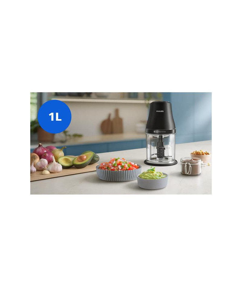 Hachoir Philips HR1501/00 - Compact et performant, ce hachoir de la série 3000 simplifie la préparation de vos repas au quotidien - Son moteur de 450 W garantit un hachage rapide et homogène, idéal pour les oignons, herbes, fruits secs ou encore la viande - Grâce à la technologie PowerChop associant des lames inox, un angle de coupe et un bol optimisés, il offre une efficacité exceptionnelle, même sur les ingrédients les plus fermes - Ses deux vitesses permettent d’ajuster la texture selon vos envies : des morceaux pour vos tartares ou une consistance lisse pour vos sauces - Pratique, son bol de 1 litre transparent offre une bonne visibilité et passe au lave-vaisselle tout comme les lames amovibles - Sa base en caoutchouc assure une parfaite stabilité, pour un confort d’utilisation optimal - Compact et élégant, il trouve facilement sa place sur le plan de travail tout en offrant une puissance adaptée à un usage fréquent - Avec le HR1501/00, préparez vos sauces, dips et pâtes d’oléagineux maison en toute simplicité.