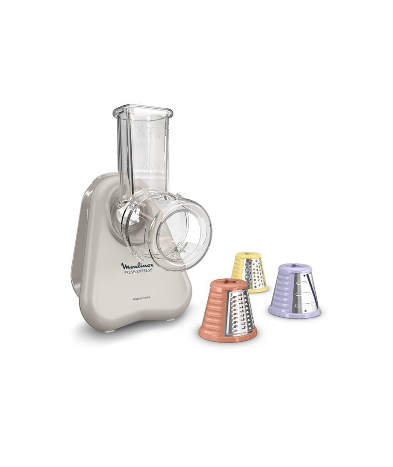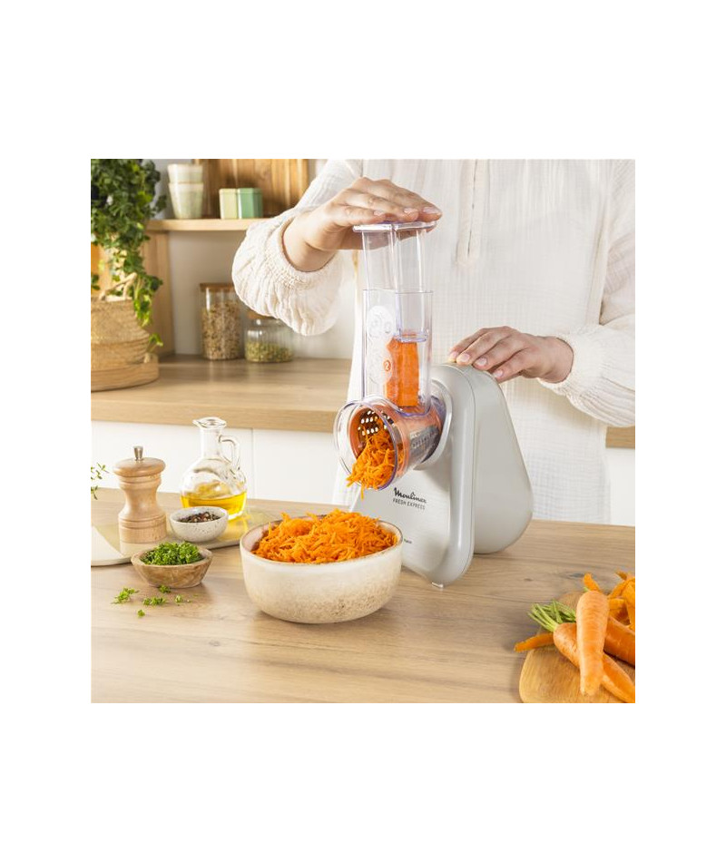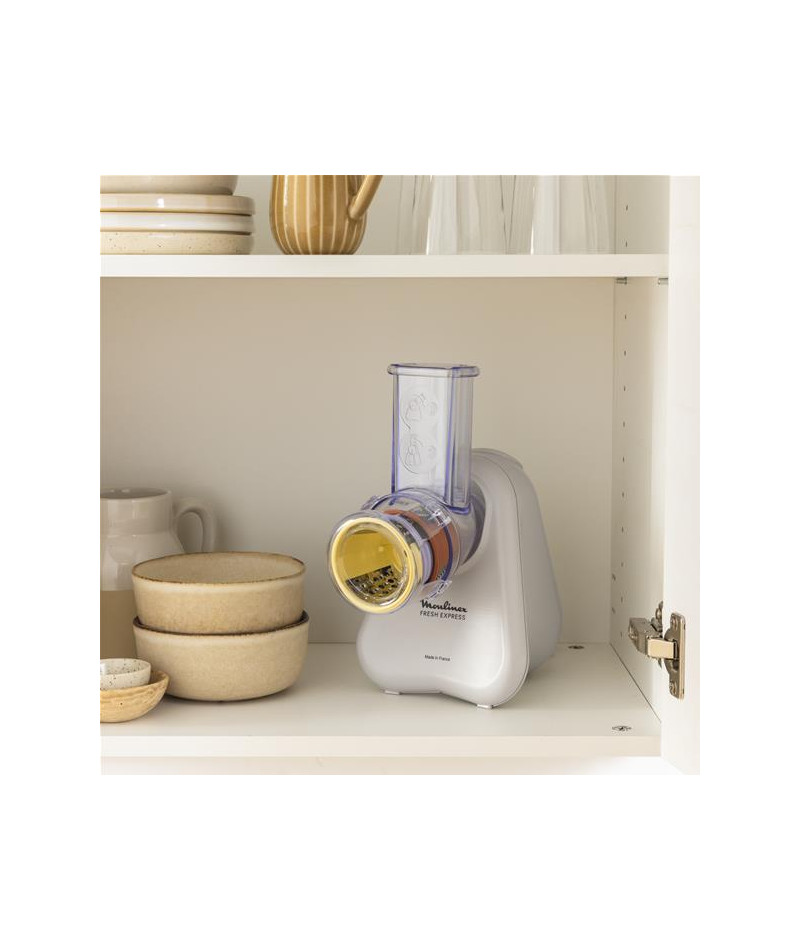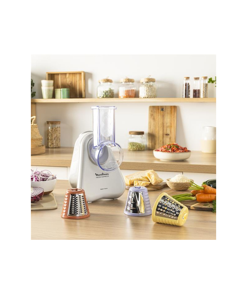 Moulinex Fresh Express DK853BE0 est le découpe-légumes électrique qui facilite la cuisine au quotidien - Compact et astucieux, il dispose de 3 cônes interchangeables permettant de râper, émincer ou trancher avec rapidité - Grâce au système de service direct, vos légumes et fromages tombent directement dans le saladier, sans étapes superflues ni corvée de nettoyage - Avec sa puissance de 150 W, il assure une découpe efficace de vos ingrédients préférés pour des plats variés et gourmands - Son format réduit trouve facilement sa place dans vos placards, et son rangement intégré pour cônes et cordon vous simplifie la vie - Fabriqué en France, il bénéficie d’un engagement de réparabilité de 15 ans, un vrai gage de durabilité - Les accessoires passent au lave-vaisselle pour un entretien facile et rapide - Idéal pour ajouter une touche de fraîcheur et de créativité à vos recettes de tous les jours.