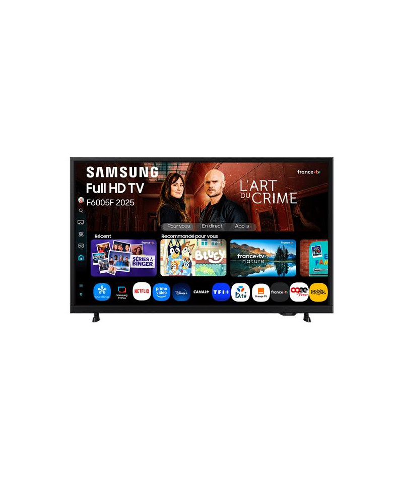Téléviseur LED Full HD 81 cm - Samsung TU32F6005FK - Ce téléviseur Full HD vous propose l’essentiel de l’expérience Samsung dans un format compact de 32 pouces - Idéal pour une chambre, une cuisine ou un bureau, il combine une résolution Full HD (1920 x 1080) à un affichage LED lumineux avec support HDR10+ pour une image plus contrastée - Le traitement Micro Dimming Pro optimise les zones sombres et claires de l’image pour un rendu plus homogène - Côté son, ce modèle bénéficie de la technologie OTS Lite pour une spatialisation sonore immersive, et du Q-Symphony pour synchroniser les haut-parleurs de la TV avec ceux d’une barre de son compatible - La puissance audio est de 10W en 2.0 canaux - L’interface Smart TV Tizen donne accès aux principales plateformes de streaming dans une navigation fluide ainsi qu'aux applications opérateurs comme B.TV+, Orange TV, SFR TV ou OQEE by Free - Il est compatible CI+ (1.4) et propose une connectique simple mais suffisante avec 2 ports HDMI, 1 port USB-A et un port Ethernet - Son design noir sobre avec pieds bas se fond facilement dans tous les décors.