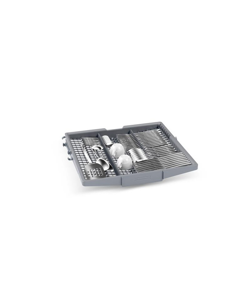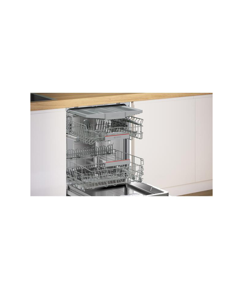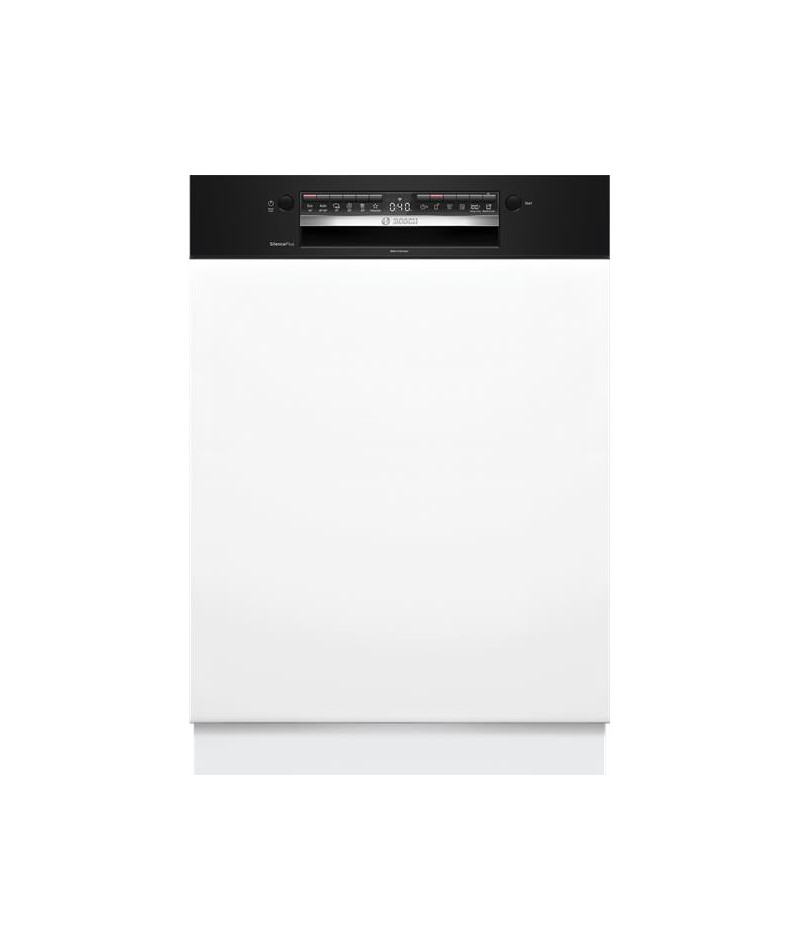 Lave-vaisselle encastrable Bosch SMI4HCB07E Série 4 60 cm avec bandeau noir - Ce modèle accueille jusqu’à 14 couverts et propose 6 programmes adaptés à chaque besoin dont Eco 50 °C pour un lavage économe et Auto 45-65 °C qui ajuste automatiquement les paramètres - Le programme Intensif 70 °C garantit une propreté parfaite tandis que Silence 50 °C permet un fonctionnement encore plus discret à seulement 41 dB - Les options incluent Séchage Extra pour un résultat optimal, SpeedPerfect+ pour réduire la durée des cycles, la demi-charge pour plus de flexibilité ainsi que Home Connect pour piloter et diagnostiquer l’appareil à distance - Le départ différé de 1 à 24 h et l’affichage du temps restant renforcent le confort d’utilisation - Les paniers Flex sont modulables avec un panier supérieur réglable en hauteur grâce au système RackMatic, des supports à tasses et des picots rabattables - Un tiroir à couverts dédié libère de l’espace dans le panier inférieur et simplifie le rangement des ustensiles - La cuve inox assure robustesse et durabilité - Le moteur EcoSilence Drive offre efficacité et silence de fonctionnement - Côté sécurité, l’appareil est équipé du système AquaStop et d’une sécurité enfants - Le triple filtre autonettoyant contribue quant à lui à un entretien facilité - Cet appareil est intégrable : Il est livré sans habillage ni porte décorative, afin de vous permettre de l’assortir au mobilier et à la couleur de votre cuisine.
