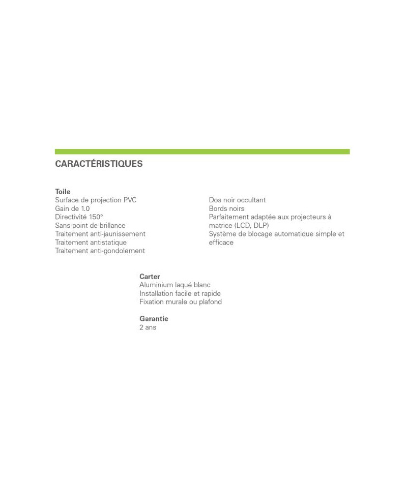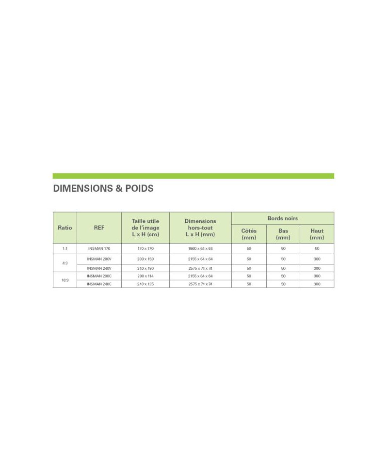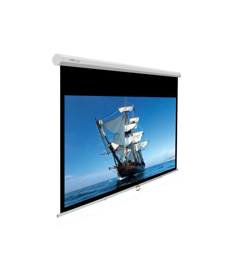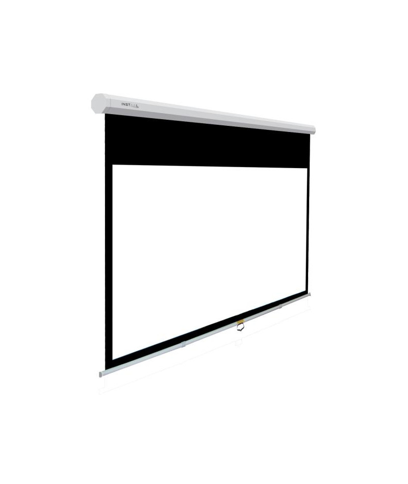 Écran manuel INSTAAL format 4/3 - Taille utile de l'image : 200 x 150 cm. Toile blanc mât, bords noirs. INSMAN offre le meilleur rapport qualité/prix pour un écran manuel : toile traitée pour une image parfaite, bords noirs, extra-drop pour un meilleur contraste, dos occultant pour le placer devant une fenêtre. Le système de fixation rapide et sûr permet un montage au mur et au plafond.