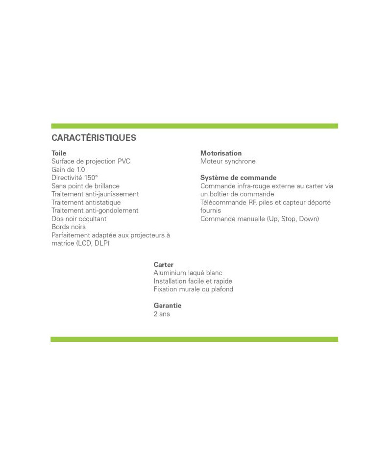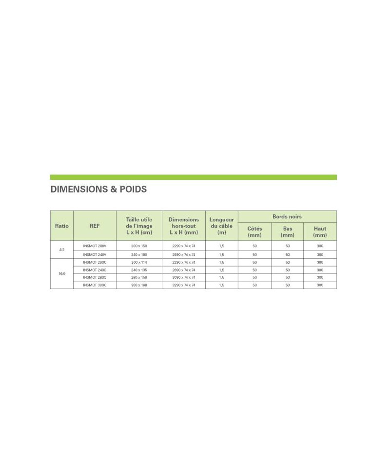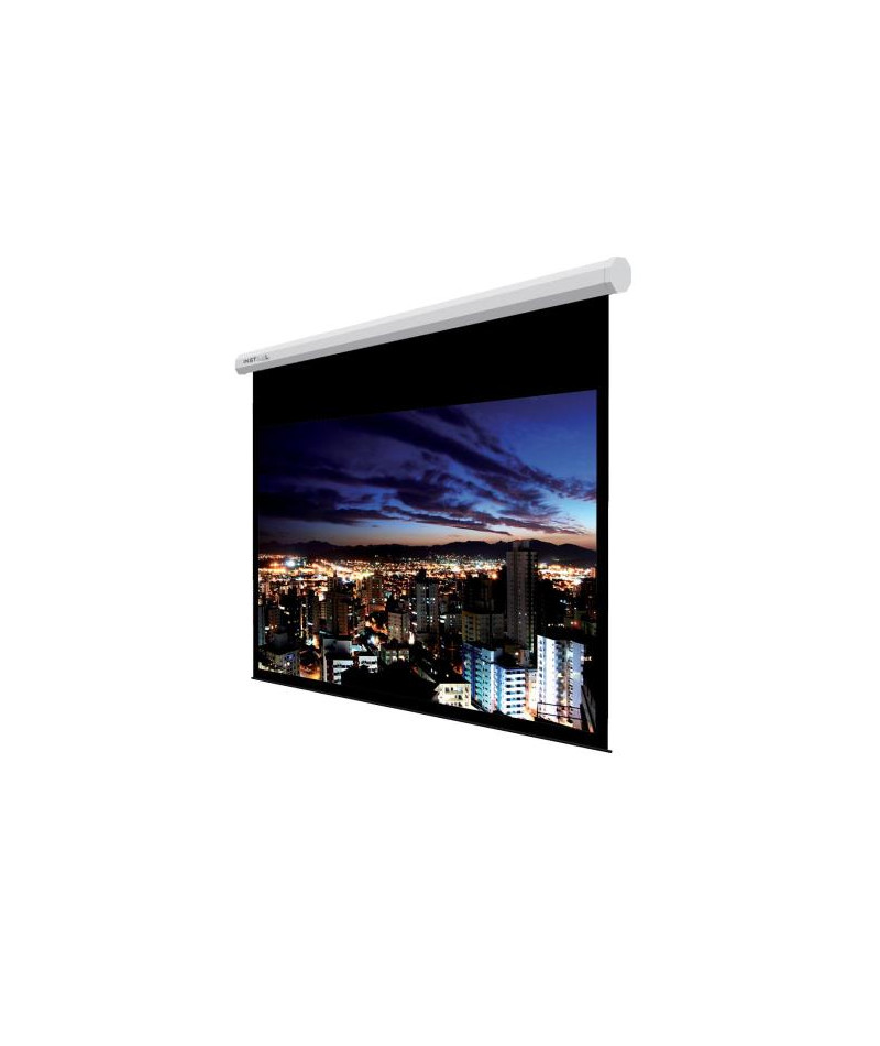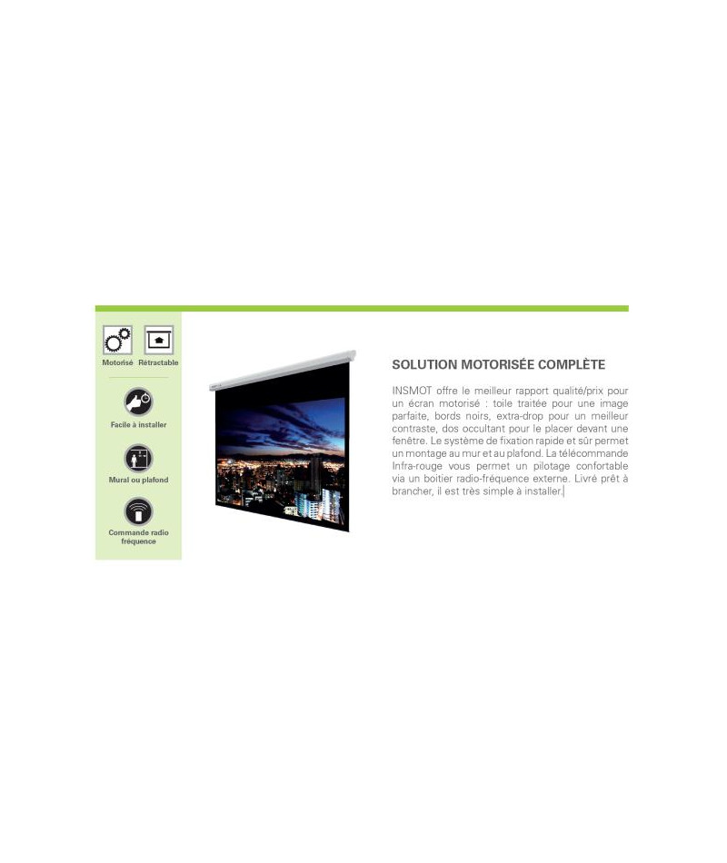 Écran motorisé INSTAAL format 4/3 - Taille utile de l'image : 200 x 150 cm. Toile blanc mât, bords noirs.Solution motorisée complète. INSMOT offre le meilleur rapport qualité/prix pour un écran motorisé : toile traitée pour une image parfaite, bords noirs, extra-drop pour un meilleur contraste, dos occultant pour le placer devant une fenêtre. Le système de fixation rapide et sûr permet un montage au mur et au plafond. La télécommande Infra-rouge vous permet un pilotage confortable via un boitier radio-fréquence externe. Livré prêt à brancher, il est très simple à installer.