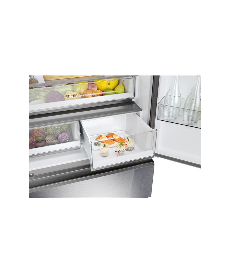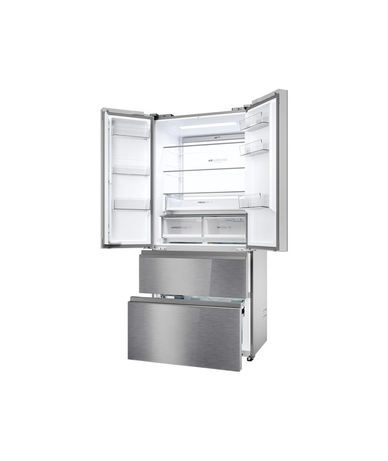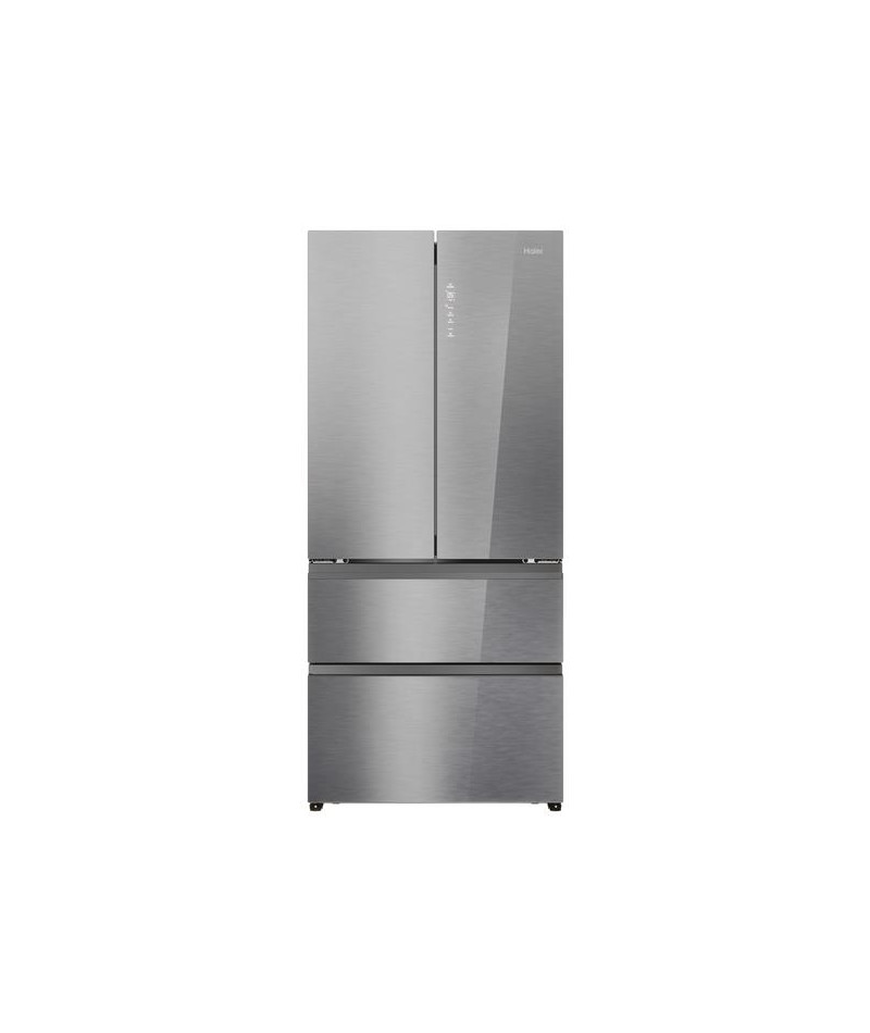 Réfrigérateur 2 portes + 2 tiroirs Haier HFR7819ENGC - Avec une capacité totale de 504 L, dont 344 L pour la réfrigération et 160 L pour la congélation, ce modèle offre un espace généreux et une organisation optimale - Le froid Total No Frost Air Surround assure une diffusion homogène de l’air pour préserver plus longtemps la fraîcheur et le goût des aliments - Le compresseur Inverter garantit des performances constantes tout en réduisant la consommation d’énergie et le niveau sonore - Les commandes électroniques en façade permettent un réglage simple et précis des températures et des fonctions - L’éclairage Daylight en colonne diffuse une lumière puissante et homogène sur l’ensemble du réfrigérateur, améliorant la visibilité sans éblouir - Le traitement antibactérien ABT PRO agit dans les deux compartiments pour éliminer 99,99 % des bactéries et contribuer à une meilleure hygiène - Le réfrigérateur dispose de 4 clayettes en verre trempé, 6 balconnets de porte, une FreshBox, un compartiment My Zone et une Humidity Zone pour adapter les conditions de conservation selon les aliments - La fonction super réfrigération permet de refroidir rapidement après un plein chargement - Le congélateur est équipé de 2 tiroirs transparents offrant une grande capacité et un accès pratique - Pose-libre, il mesure 190 x 83 x 63,6 cm et séduit par son design en inox avec revêtement verre Iconic Glass et poignées intégrées.