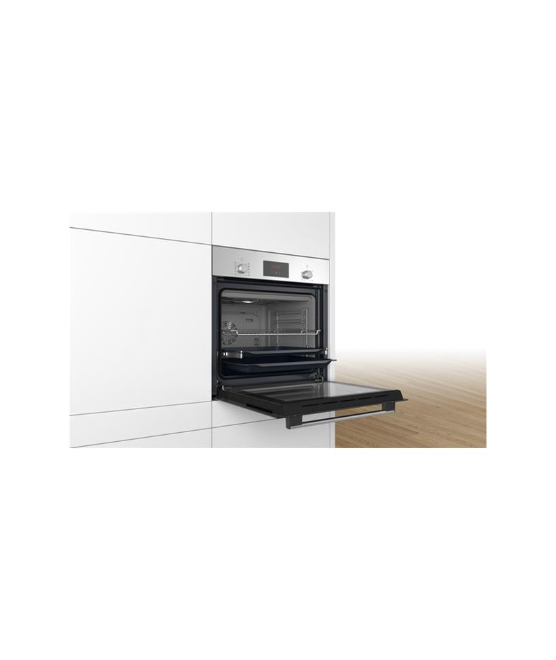 Four EcoClean - Ligne Série 2 - Nettoyage EcoClean 4 parois - 7 modes de cuisson dont Hotair 3D et Pizza - Programmateur électronique - Ecran LED rouge - Boutons escamotables Push-Pull - Préchauffage Booster : votre four atteint plus rapidement la température souhaitée - Assistance Nettoyage : votre four est juste légèrement sale et vous souhaitez le nettoyer rapidement Il suffit de placer environ 400 ml d'eau et une goutte de liquide vaisselle dans un récipient, puis de régler le mode de cuisson, la température et la durée appropriés. Le système de nettoyage éco-responsable ramollit les résidus afin que vous puissiez simplement les essuyer, pour un nettoyage rapide et simple du four - Rails télescopiques sur 1 niveau - Eclairage halogène - Contre-porte plein verre - Ventilateur de refroidissement - Sécurité enfants - Finition inox anti-trace.
