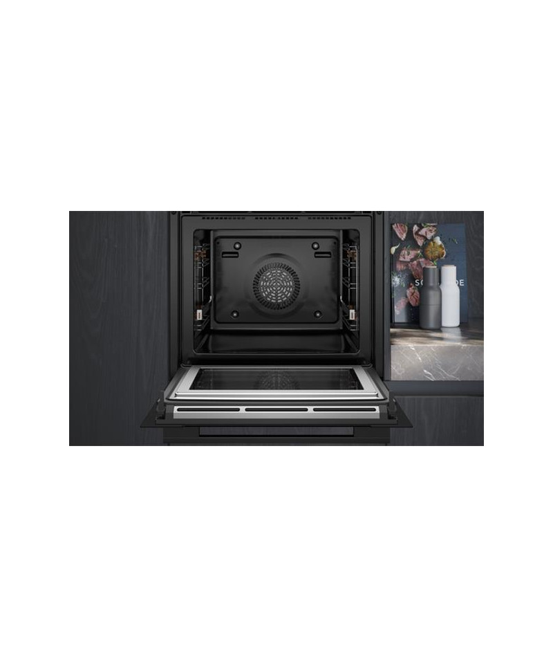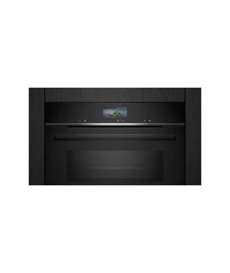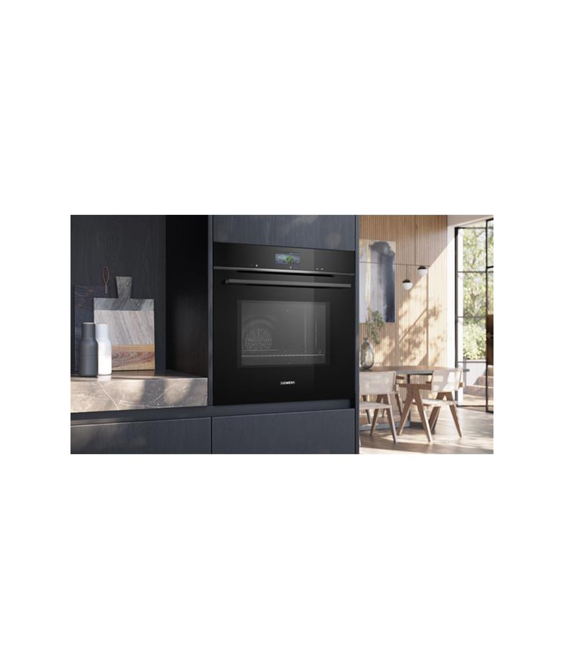 Four pyrolyse avec fonction micro-ondes - Ligne iQ700 - Ecran TFT couleur sensitif Plus : navigation d'un simple geste du doigt pour une utilisation simple et intuitive - Commandes TouchControl - Technologie Inverter : puissance micro-ondes (800 W max) régulée pour chauffer les aliments progressivement - 19 modes de cuisson dont gril air pulsé + micro-ondes et Basse température - Cuisson douce : économise de l'énergie pendant la cuisson et le rôtissage - Air pulsé 4D : la nouvelle turbine dont la rotation se fait alternativement vers la droite puis vers la gauche permet une cuisson sur 4 niveaux sans mélange d’odeurs, et sans préconisation de hauteur de gradins - Préchauffage Booster : chauffe facile et rapide - Cooking Assist : large choix de recettes - CookControl Pro : des plats de haut vol, peu importe la recette ou les circonstances - Préconisation de température - Affichage de la température - Contrôle optique de la montée en température - Home Connect : pilotage et contrôle de votre four à distance - Assistant à commande vocale - HumidClean Plus : pour un nettoyage rapide, la saleté est préalablement ramollie par la vaporisation d'eau savonneuse. Elle peut alors être enlevée plus facilement - Eclairage LED - Rails télescopiques sur 1 niveau pyrolysables - Porte froide 4 vitres avec Soft Open et Soft Close - Ventilateur de refroidissement - Sécurité enfants.