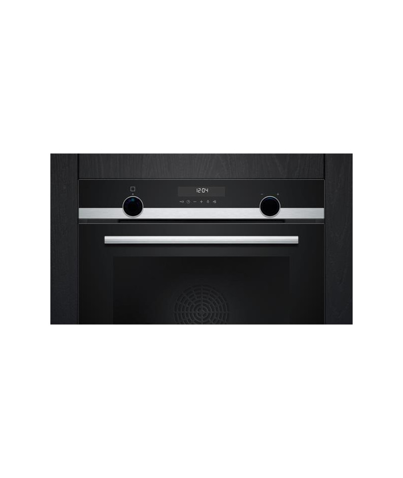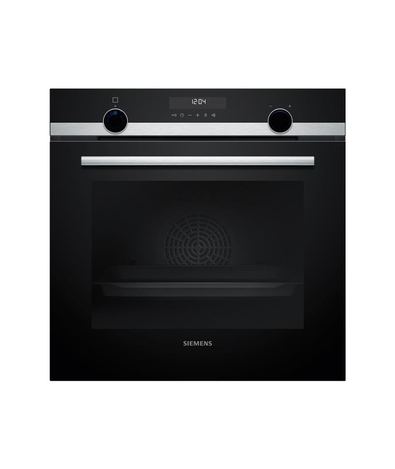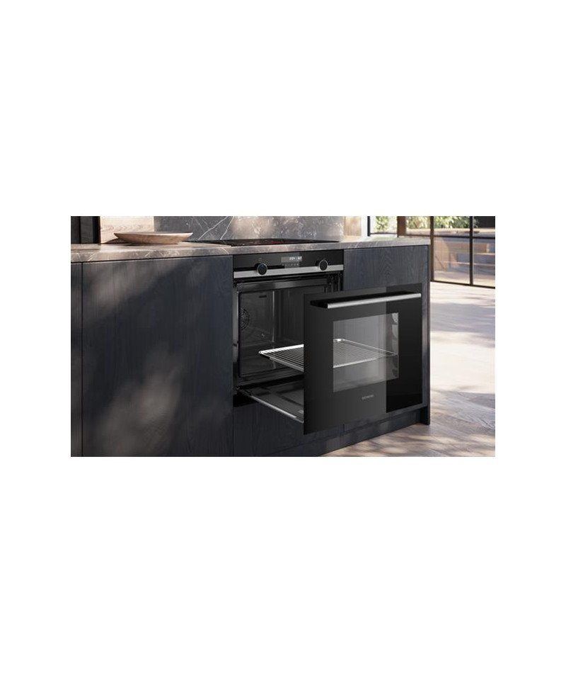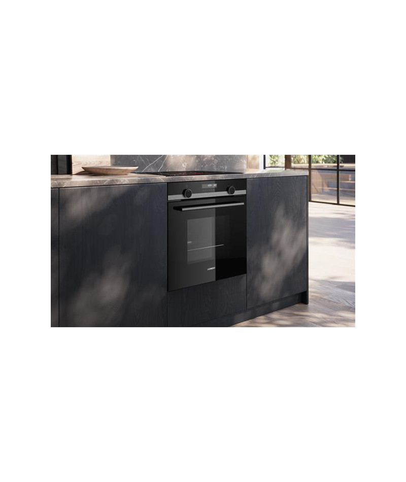 Four pyrolyse Siemens HB578HBS7 iQ500 Inox - Ce four encastrable de 71 L se distingue par sa porte tiroir qui coulisse en douceur pour un accès simplifié à la cavité, idéal dans les configurations de cuisine à hauteur ergonomique - Son design premium mêle verre noir et inox brossé, sublimé par deux boutons rétroéclairés lightControl et un écran LCD clair - Il propose 8 modes de cuisson dont air pulsé 3D pour une répartition homogène de la chaleur, convection naturelle, gril air pulsé, gril grande surface, position pizza, chaleur douce hotAir, cuisson basse température et coolStart pour les plats surgelés - La connectivité Home Connect permet de piloter le four à distance depuis un smartphone ou à la voix via un assistant vocal - Côté confort, il intègre un départ automatique, une préconisation de température, un booster de préchauffage, une fonction Sabbat et un contrôle optique de la montée en température - Son nettoyage pyrolyse activeClean simplifie l’entretien en éliminant les résidus à haute température - Niveau équipement, on retrouve une cavité émaillée anthracite, une porte froide 4 vitres, un ventilateur de refroidissement et une poignée inox robuste - Les accessoires inclus sont une grille, une lèchefrite et une tôle de cuisson émaillée - Sécurité renforcée : verrou électronique, sécurité enfants, coupure automatique et indicateur de chaleur résiduelle.