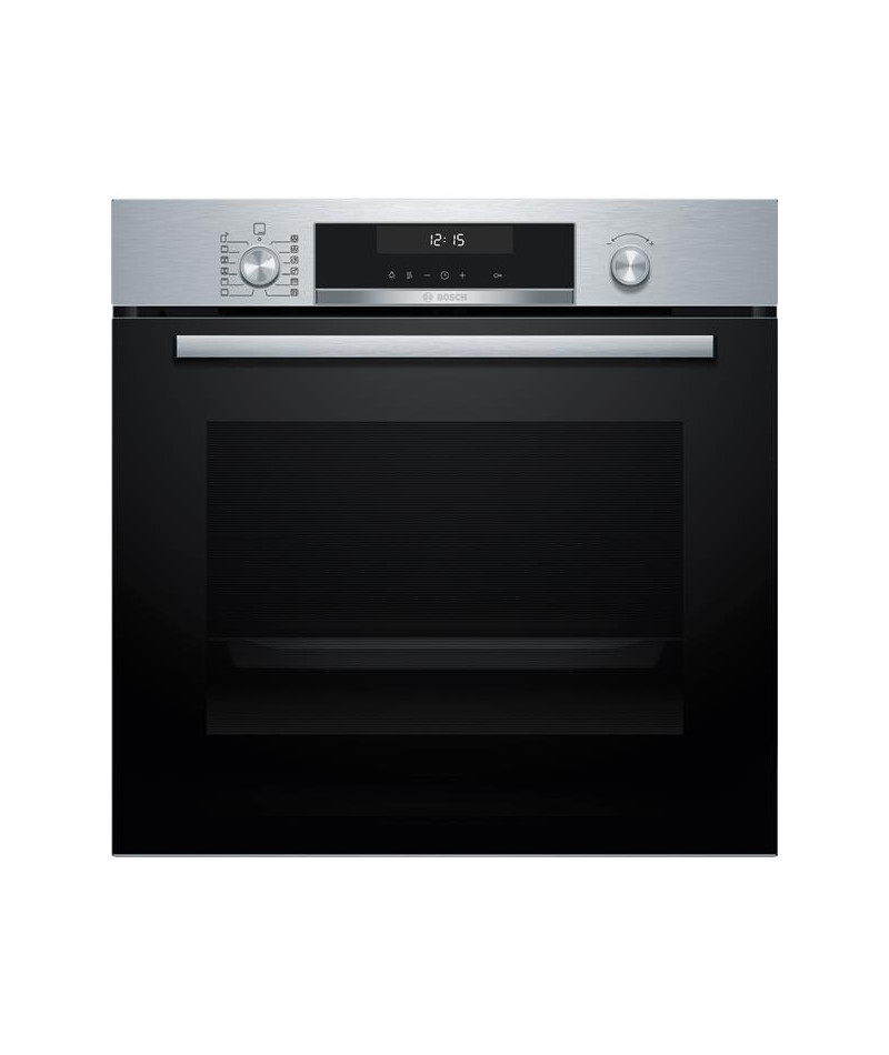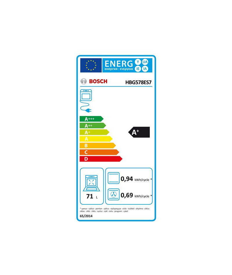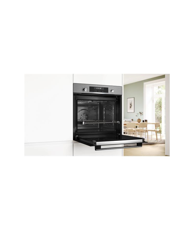 Four pyrolyse Bosch HBG578ES7 Série 6 Inox - Ce four encastrable séduit par son design moderne avec bandeau en inox et afficheur LCD clair - Doté de commandes électroniques par boutons escamotables, il est simple d’utilisation et pratique à nettoyer - Il propose 30 programmes automatiques grâce à AutoPilot ainsi que 9 modes de cuisson dont Hotair 3D, convection naturelle, gril air pulsé, position pizza, cuisson basse température ou encore Air Fry pour des résultats variés et réussis - La connectivité Home Connect permet de piloter et contrôler l’appareil à distance depuis un smartphone ou une tablette - Côté confort, il bénéficie d’une capacité de 71 L, d’une horloge électronique, d’une préconisation de température, d’un départ différé, d’un booster de préchauffage, d’un contrôle optique de la montée en température et même d’une fonction Sabbat - Niveau équipement, on retrouve un éclairage halogène, une porte froide 4 vitres avec fermeture douce SoftMove, un ventilateur de refroidissement ainsi qu’une cavité émaillée anthracite - Les accessoires inclus sont une grille, une lèchefrite pyrolyse et une plaque chauffante Air Fry, avec rails télescopiques sur 1 niveau - La sécurité est assurée par un verrou électronique, un indicateur de chaleur résiduelle, une coupure automatique et une sécurité enfants, même lors des cycles pyrolyse.