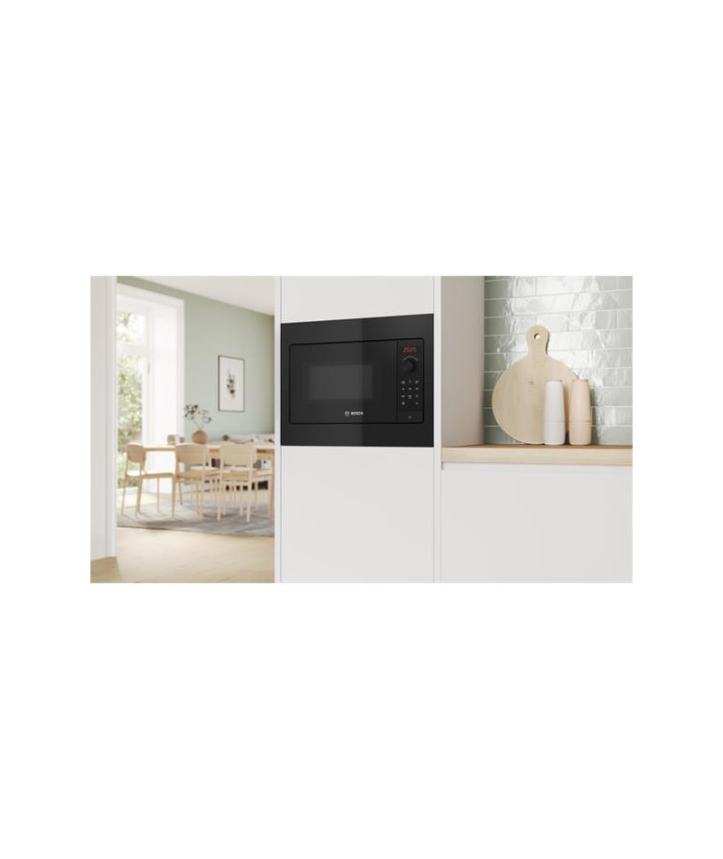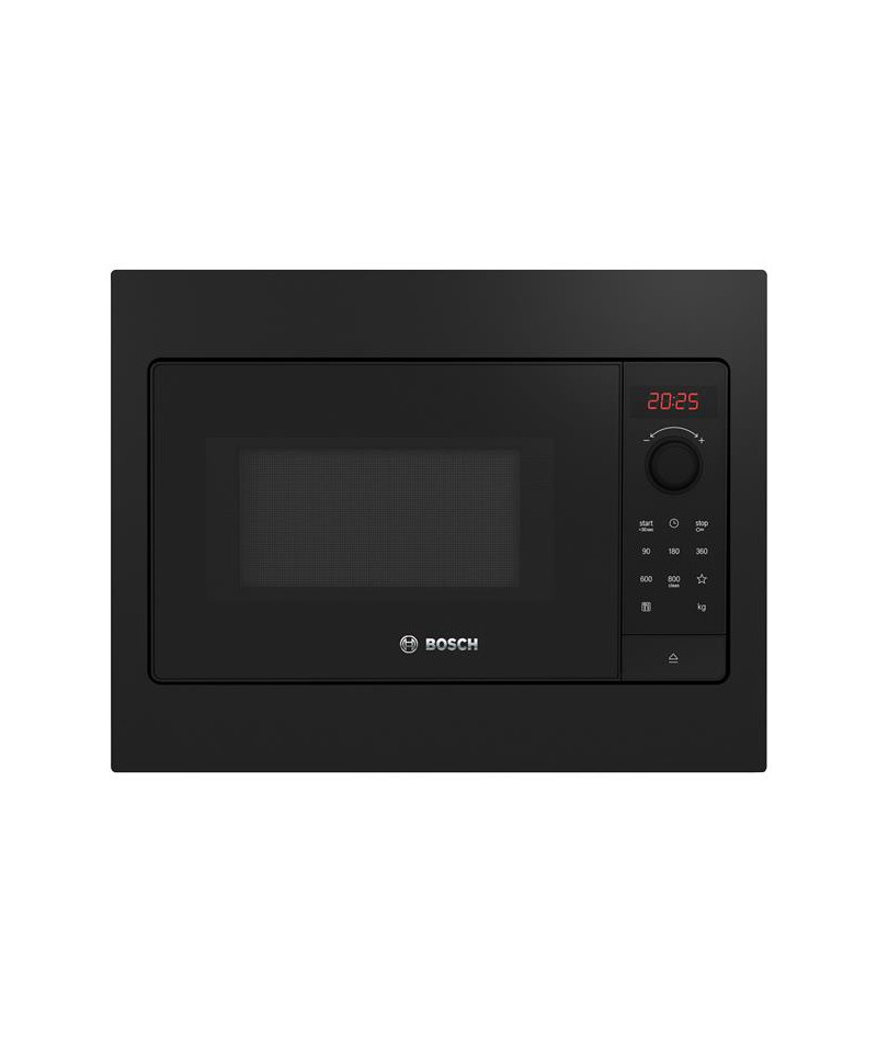 Micro-ondes solo intégrable Bosch BFL523MB4 Série 2 Noir - Hauteur niche 38 cm - Largeur niche 50 cm - Avec ses 5 niveaux de puissance allant de 90 à 800 W, ce modèle s’adapte à toutes vos préparations - Les commandes électroniques combinant touches tactiles, boutons rotatifs et écran LED offrent une utilisation intuitive et précise - Les 7 programmes automatiques AutoPilot simplifient la cuisson, dont 4 dédiés à la décongélation et 3 à la cuisson micro-ondes, avec en plus un bouton Favoris et la fonction Quick Start pour ajouter 30 secondes d’un simple geste - Le plateau tournant en verre de 27 cm assure une répartition homogène de la chaleur - La cavité gris laqué bénéficie d’un éclairage LED basse consommation et du programme de nettoyage hydrolyse pour limiter les efforts d’entretien - La porte à ouverture latérale avec charnières à gauche permet un accès facile même dans un meuble haut - Côté sécurité, l’appareil intègre un verrouillage enfants, une coupure automatique et un ventilateur de refroidissement pour une tranquillité totale.
