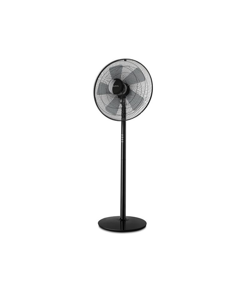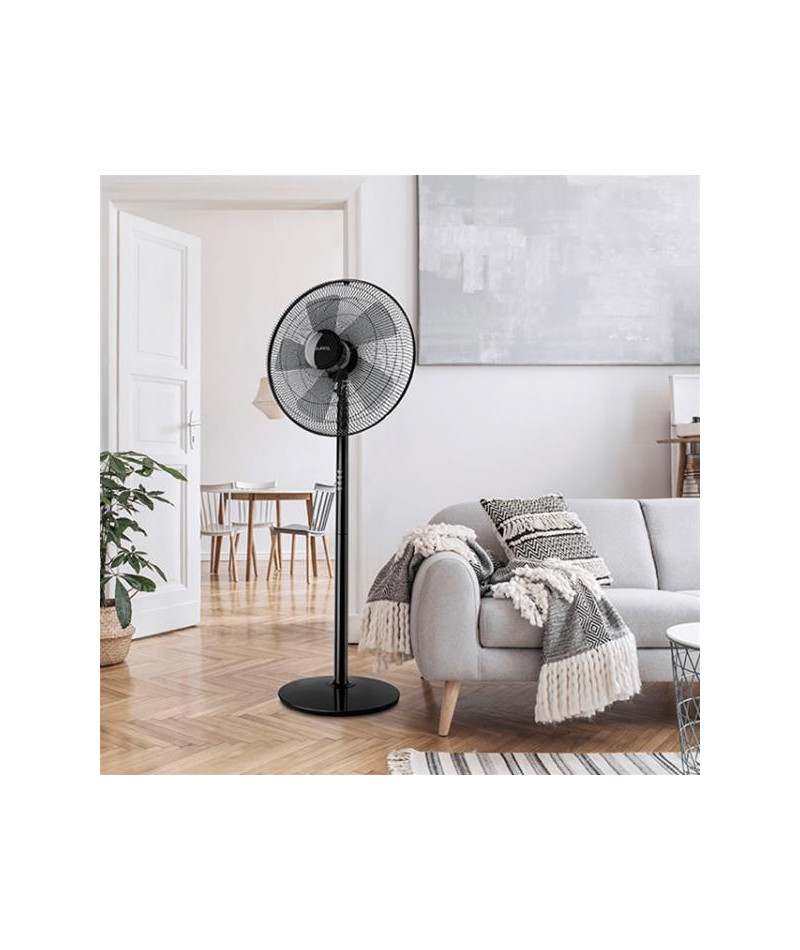 Ventilateur sur pied - 3 vitesses - Commande mécanique - Fonction Oscillation - 5 pales en ABS Ø 40 cm - Grille amovible facile à nettoyer - Inclinaison réglable - Base ronde anti-dérapante - Poignée de transport - Démontable - Finition noir brillant.