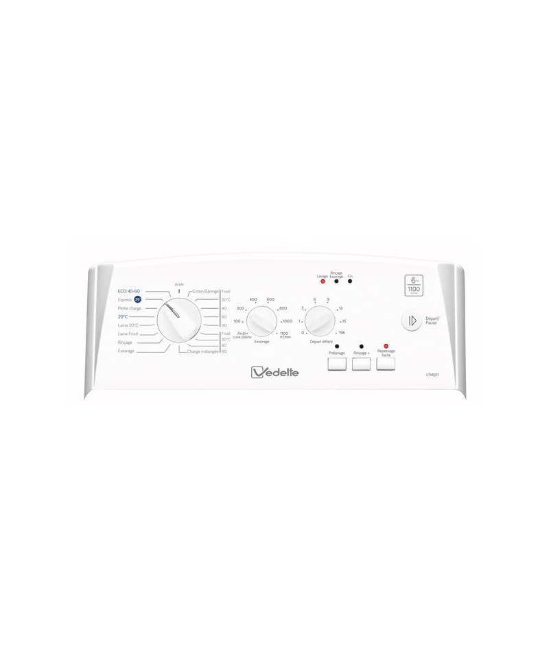 Le lave-linge top Vedette LTV6011 offre une capacité de 6 kg et une vitesse d’essorage maximale de 1100 tours par minute - Il propose 17 programmes adaptés à tous les types de textiles, du coton au linge délicat en passant par la laine - Le programme Express 39 min permet de rafraîchir une petite charge à 40 °C, tandis que le mode Eco 40-60 assure un lavage efficace et économe - Ses options pratiques incluent le départ différé jusqu’à 19 heures pour profiter des heures creuses, le prélavage pour le linge très sale, le rinçage plus pour éliminer les résidus de lessive et la fonction repassage facile pour réduire les plis - Son moteur standard garantit une utilisation fiable et simple d’entretien - Le tambour inox de 42 litres assure une excellente longévité et un brassage optimal - Grâce à sa fonction d’arrêt positionné, l’ouverture du tambour est toujours accessible en fin de cycle - Les sécurités anti-débordement et anti-balourd garantissent un usage en toute tranquillité.