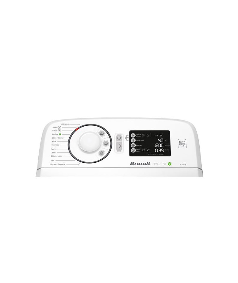 Lave-linge top Brandt BT16524 - Compact et simple à utiliser, ce lave-linge top de 6,5 kg offre des performances fiables et un grand confort d’utilisation - Sa vitesse d’essorage de 1200 tr/min garantit un linge bien essoré, tout en maîtrisant la consommation d’énergie - Avec 12 programmes variés, il s’adapte à tous les textiles : du cycle délicat/laine au programme Chemises, sans oublier le Rapide 39 min pour un lavage efficace en un temps record ou encore le programme Hygiène qui élimine jusqu’à 99,9 % des bactéries grâce à une température constante supérieure à 60 °C - Ses options pratiques, comme le départ différé jusqu’à 24 h, le rinçage+ ou la fonction repassage facile, permettent d’optimiser chaque cycle selon vos besoins - Son affichage digital indique clairement le temps restant, pour un meilleur suivi - Équipé d’un tambour inox de 42 L, ce modèle dispose d’une capacité variable automatique pour ajuster la quantité d’eau à la charge - Les sécurités enfants, anti-débordement et anti-balourd assurent une utilisation sereine - Son design sobre et ergonomique, avec bandeau digital et finition blanche, s’intègre facilement dans toutes les configurations.
