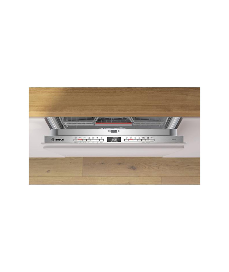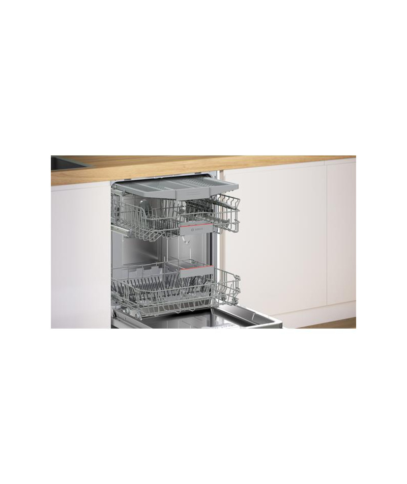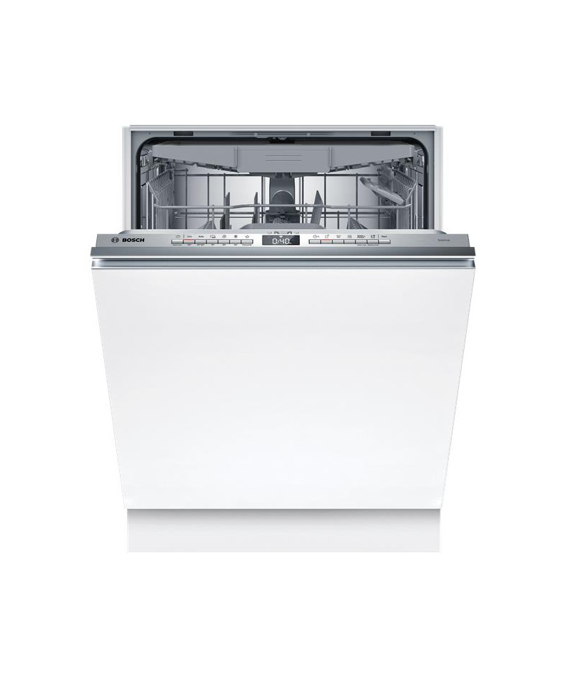 Lave-vaisselle tout intégrable Bosch SMV4HVX14E Série 4 60 cm - Ce modèle accueille jusqu’à 14 couverts et offre 6 programmes dont Eco 50 °C pour des économies d’énergie, Auto 45-65 °C qui adapte les paramètres selon la charge et Intensif 70 °C pour une propreté irréprochable - Le programme Silence 50 °C assure un lavage discret à 45 dB et le cycle 1h 65 °C permet un nettoyage rapide et efficace - Les options incluent Home Connect pour piloter et diagnostiquer à distance, SpeedPerfect+ qui réduit la durée des cycles, Séchage Extra pour améliorer le séchage du plastique et demi-charge pour plus de souplesse - Le départ différé 1-24 h, le signal sonore de fin de cycle et l’affichage InfoLight rouge facilitent l’usage au quotidien - Les paniers VarioFlex et le tiroir à couverts offrent une grande modularité, avec un panier supérieur réglable RackMatic et des rangées de picots rabattables - La cuve polinox assure solidité et longévité - Le moteur EcoSilence Drive allie performance et fiabilité - Les sécurités comprennent l’AquaStop, une garantie contre les fuites, ainsi que l’AquaSensor et un échangeur thermique qui protègent la vaisselle - Le triple filtre autonettoyant facilite l’entretien - Cet appareil est intégrable : Il est livré sans habillage ni porte décorative, afin de vous permettre de l’assortir au mobilier et à la couleur de votre cuisine.