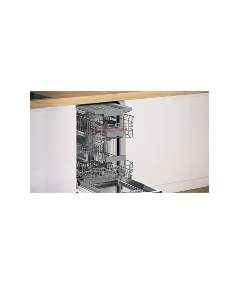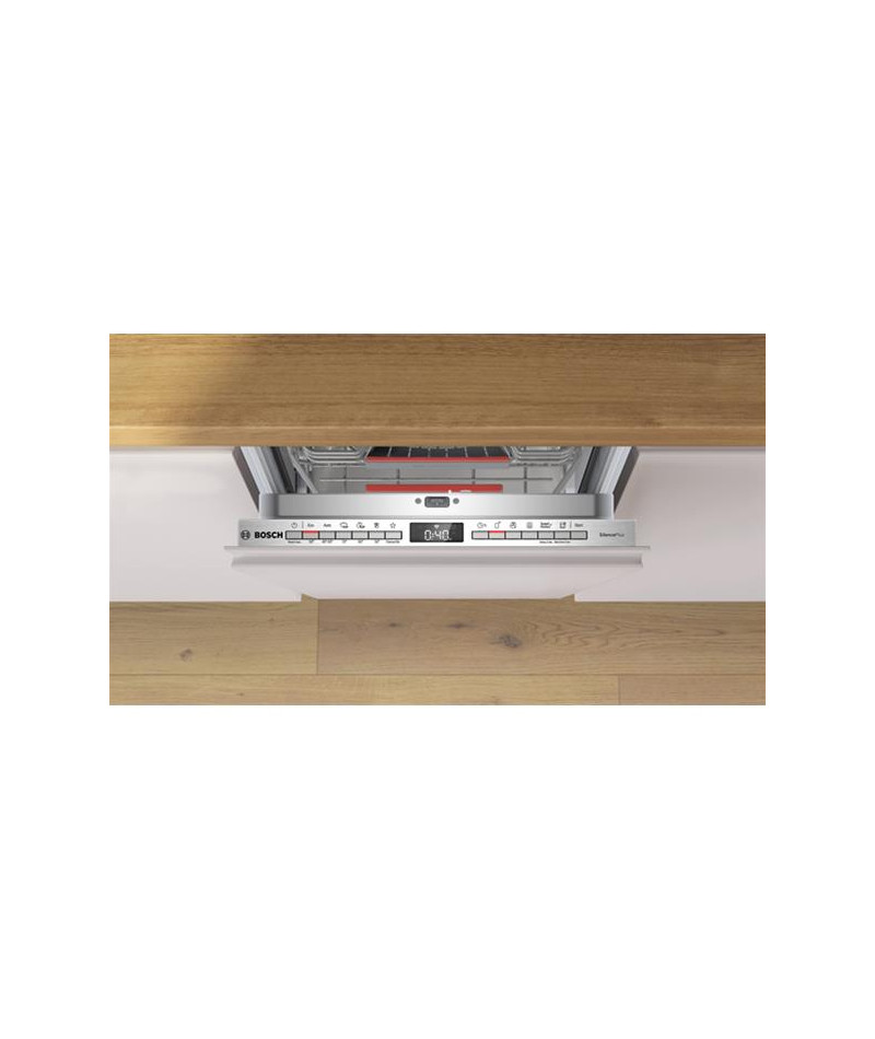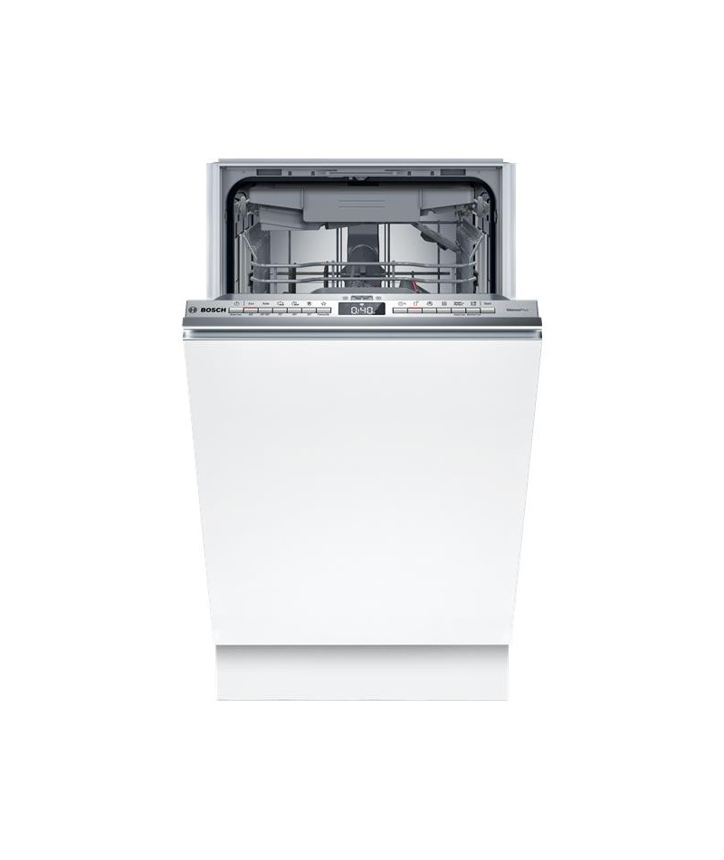 Lave-vaisselle tout intégrable Bosch SPV4EMX17E Série 4 45 cm - Ce modèle compact accueille jusqu’à 10 couverts et combine efficacité et praticité - Il propose 6 programmes dont Eco 50 °C pour un lavage économe, Auto 45-65 °C qui ajuste automatiquement les paramètres et Intensif 70 °C pour une hygiène parfaite - Le programme Silence 50 °C permet un fonctionnement discret à 43 dB et le cycle Quotidien 60 °C répond aux besoins rapides - Les options incluent EfficientDry avec ouverture automatique de porte pour un séchage optimisé, SpeedPerfect+ pour diviser par trois la durée du cycle, Zone Intensive pour renforcer le lavage sur le panier inférieur et Home Connect pour contrôler l’appareil à distance - Le départ différé de 1 à 24 h, le signal sonore de fin de cycle et l’InfoLight rouge apportent un vrai confort d’usage - Les paniers MaxFlex sont modulables avec un tiroir à couverts Slimline, un panier supérieur réglable RackMatic et des zones à picots rabattables - Le bras de lavage DuoPower assure une meilleure couverture - La cuve inox offre robustesse et hygiène durable - Le moteur EcoSilence Drive garantit performance et discrétion avec seulement 44 dB - Les sécurités incluent AquaStop et un échangeur thermique pour protéger la vaisselle - Le triple filtre autonettoyant simplifie l’entretien - Cet appareil est intégrable : Il est livré sans habillage ni porte décorative, afin de vous permettre de l’assortir au mobilier et à la couleur de votre cuisine.