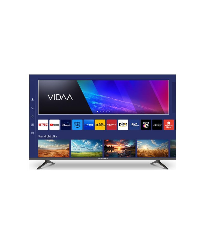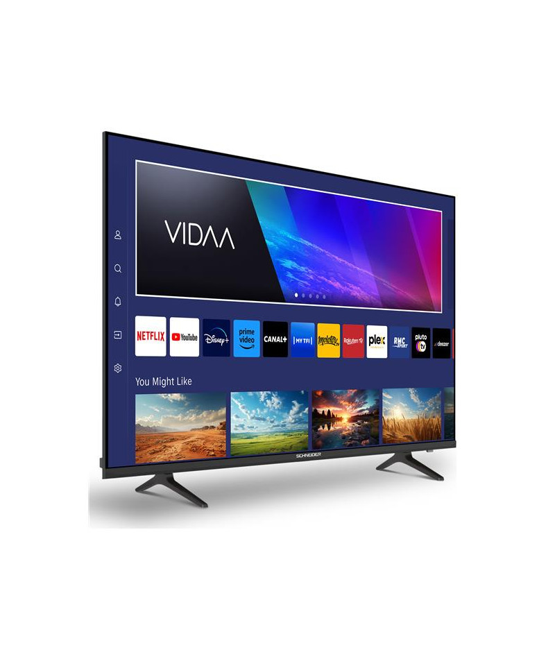 TV QLED 4K UHD 109 cm Schneider 43A1 - Plongez dans un spectacle visuel saisissant avec une image 4K Ultra Haute Définition 3840 x 2160 pixels aux couleurs intenses et aux détails ultra précis - Sa technologie QLED-LCD associée à un rétroéclairage Direct LED offre un contraste de 1100:1 et une luminosité de 200 cd/m² pour des noirs plus profonds et des couleurs éclatantes - L’upscaling transforme vos contenus SD en qualité proche du 4K UHD pour une immersion renforcée - Côté connectivité, le 43A1 embarque 3 ports HDMI 2.0, 2 ports USB, une entrée AV/Audio et une sortie coaxiale pour connecter facilement consoles, barres de son ou lecteurs - Son triple tuner DVB-T/T2/C/S2 garantit la réception complète de vos chaînes sans boîtier externe - La partie Smart TV VIDAA propose un catalogue d’applications populaires comme Netflix, Prime Video ou YouTube, le tout enrichi par la connectivité Wi-Fi et Bluetooth pour relier vos appareils sans fil - Le son Dolby Audio stéréo 2 x 8 W RMS complète l’expérience avec clarté et puissance - Son mode moniteur PC via HDMI le rend polyvalent, tandis que son design élégant avec fixation VESA 200 x 200 mm s’intègre parfaitement dans votre intérieur.