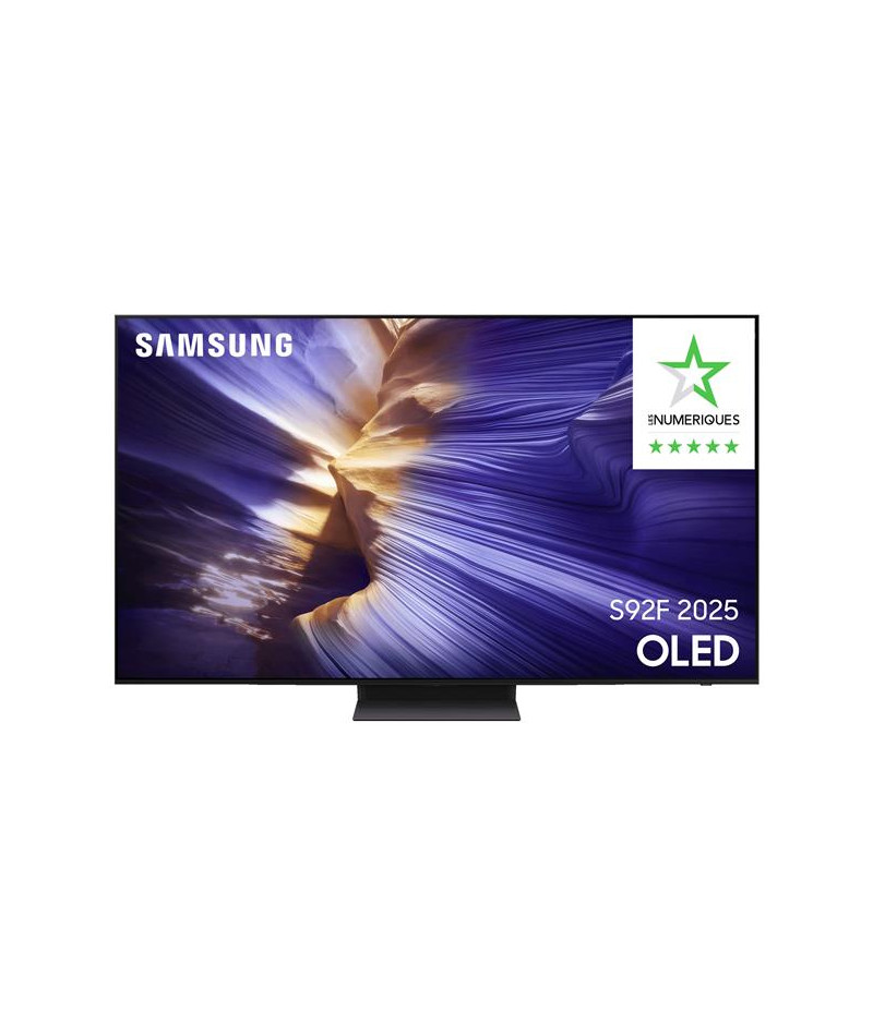 TV OLED 4K 163 cm Samsung S92F - Profitez d’une expérience visuelle spectaculaire grâce à la dalle OLED et à ses 8,3 millions de pixels auto-émissifs - La technologie HDR10+ et HLG, optimisée par IA avec Auto HDR Remastering Pro, sublime chaque contenu avec une luminosité éclatante et des contrastes intenses - Le Color Booster Pro élargit la palette de couleurs pour des images plus réalistes et immersives - Le processeur NQ4 AI Gen3 optimise et met à l’échelle tous vos contenus jusqu’en 4K avec fluidité et précision - Avec Tizen OS et One UI 2025, accédez facilement à Netflix, Disney+, Prime Video, Canal+ et bien plus encore, avec des fonctions avancées comme le Live Translate, la recherche universelle et le contrôle vocal Bixby ou Alexa - Les gamers profitent d’une fréquence native 100 Hz pouvant monter jusqu’à 144 Hz via HDMI 2.1, avec VRR, ALLM, FreeSync Premium Pro et un Gaming Hub dédié - Le son Dolby Atmos 2.1.2 de 60 W avec OTS et Q-Symphony vous plonge au cœur de l’action en suivant le mouvement à l’écran - La télécommande universelle TM2560E simplifie l’usage quotidien - Son design fin avec cadre Graphite Black et pied Space Titan allie élégance et modernité pour s’intégrer dans tous les intérieurs.