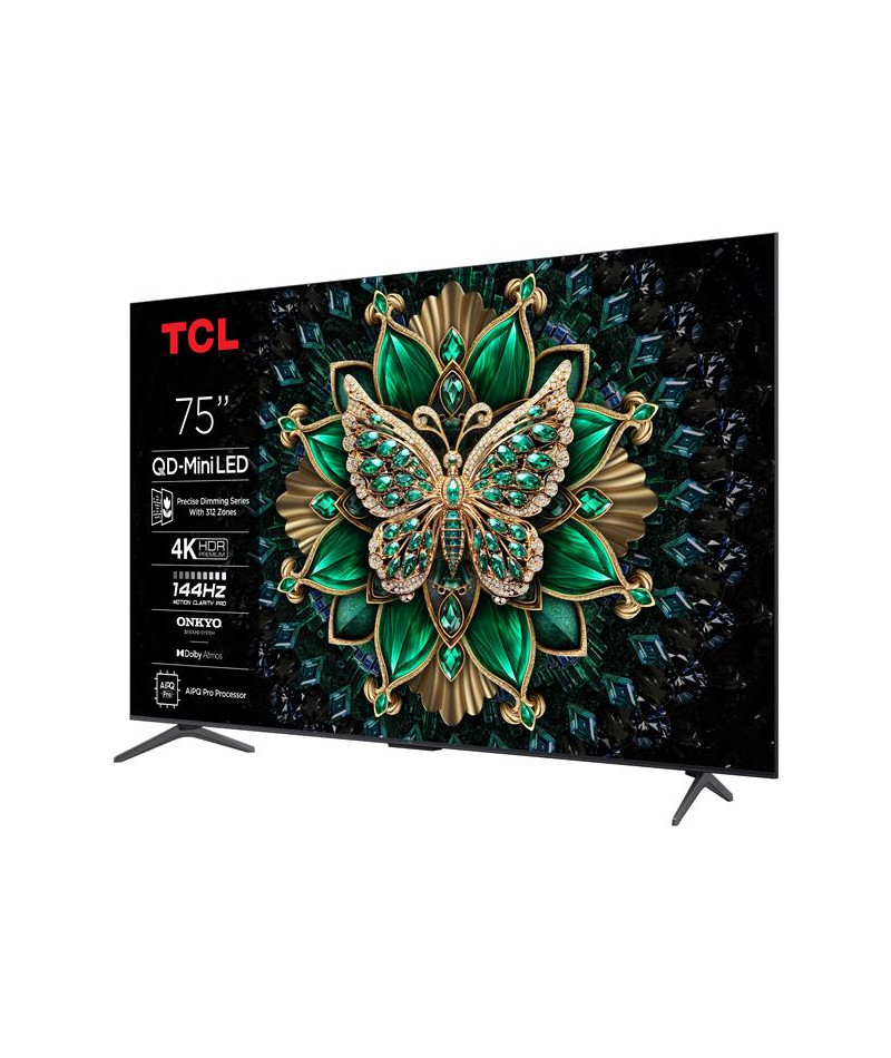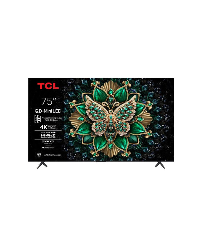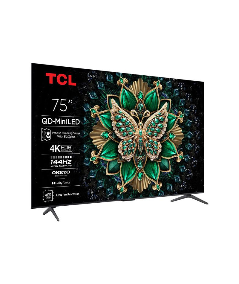TV QD-Mini LED UHD 4K 189 cm TCL 75C69K - Cette TV impressionne d’abord par sa dalle QD-Mini LED à contraste extrême et couleurs infinies grâce à la technologie Quantum Dot Pro - La prise en charge HDR Dolby Vision IQ HDR10+ HDR10 et HLG révèle chaque détail avec une luminosité et des couleurs éclatantes pour un rendu d’image spectaculaire - Avec son Precise Dimming Series jusqu’à 312 zones et son panneau HVA, elle offre des noirs plus profonds et des détails ultra-précis - Son processeur AiPQ Pro optimise chaque scène grâce à l’IA et à l’upscaling UHD Deep Learning AI SR pour un réalisme bluffant - Google TV intégré donne accès à toutes vos applications préférées comme Netflix Prime Video Apple TV+ ou Disney+ avec Chromecast intégré et contrôle vocal - Pour les gamers, HDMI 2.1 VRR FreeSync Premium Pro ALLM et affichage natif 144 Hz garantissent fluidité et réactivité - Le système sonore Onkyo 2.1 avec Dolby Atmos et DTS Virtual-X vous plonge dans l’univers sonore du cinéma - Sa télécommande RC833A avec piles incluses facilite l’accès aux fonctions clés - Enfin son design aluminium brossé aux lignes sobres et aux pieds latéraux s’intègre parfaitement dans tous les intérieurs.