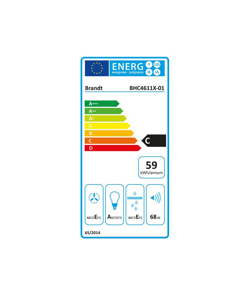Hotte visière Brandt BHC4611X - Elle propose 3 vitesses pour adapter la puissance d’aspiration à vos besoins - Ses commandes mécaniques par touches assurent une utilisation simple et intuitive - Elle offre des fonctions essentielles comme l’éclairage indépendant, la mise en marche/arrêt et la sélection des vitesses - Équipée de 2 filtres à graisse en aluminium lavables à la main, elle est livrée avec un filtre à charbon de série (référence CF180) qui permet une utilisation immédiate en mode recyclage - L’éclairage LED, composé de 2 lampes d’une puissance totale de 4 W, garantit un confort visuel optimal tout en limitant la consommation énergétique - Le diamètre de sortie est de 120 mm, accompagné d’un clapet anti-retour et d’un déflecteur pour plus d’efficacité - Finition inox avec bandeau en verre noir.